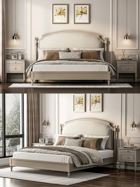 Phong cách Farmhouse lấy cảm hứng từ những ngôi nhà nông thôn châu Âu và Mỹ, với điểm nhấn là sự mộc mạc, gần gũi thiên nhiên. Giường ngủ Farmhouse thường được làm từ gỗ tự nhiên, thiết kế đơn giản với tông màu nhẹ nhàng như trắng ngà, nâu sồi hoặc xám vintage.
